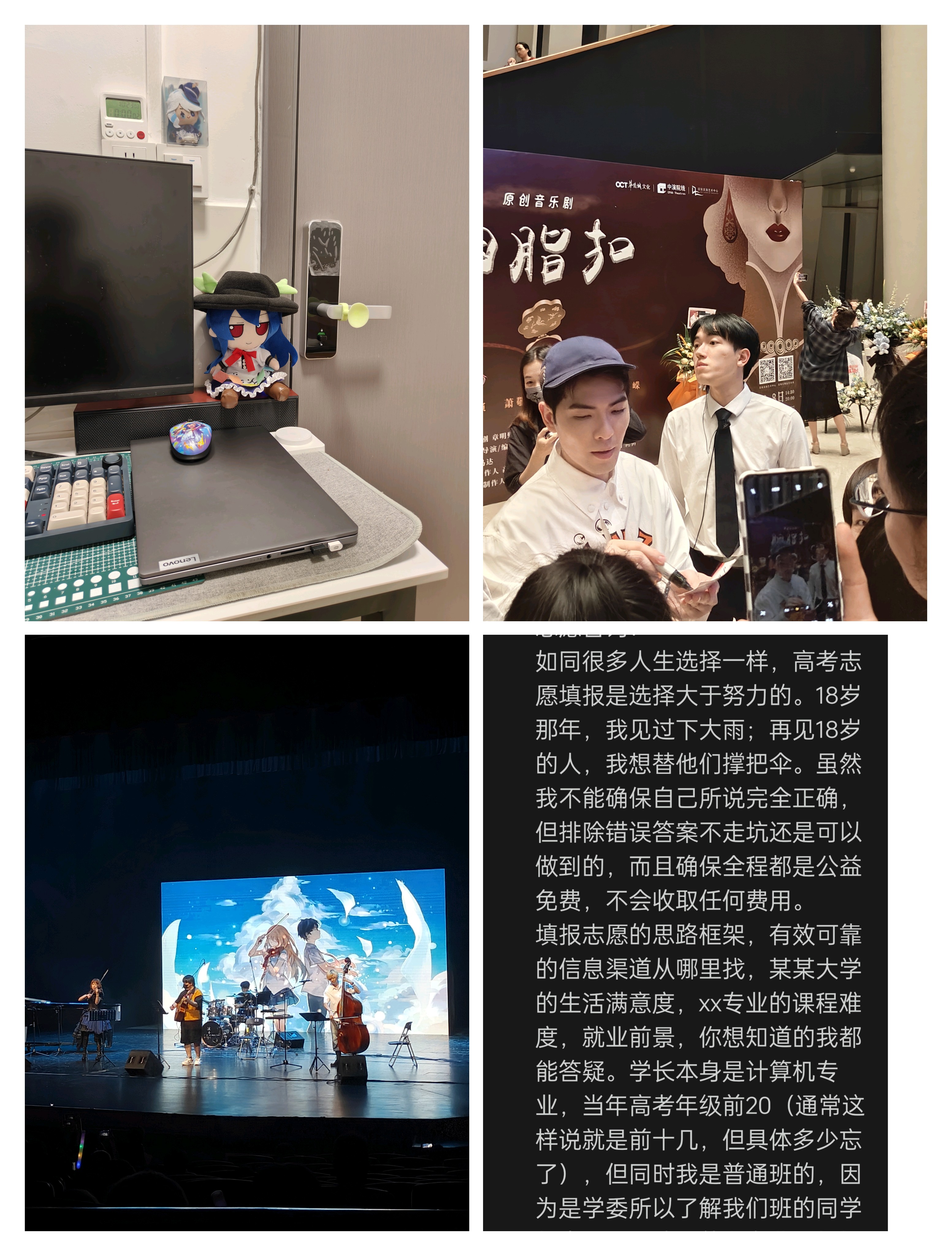 6月份正式离职了,然后搬家到光明区这边。实验室这边实习的话主要就是读论文,跑代码复现论文实验。6月的话也去看了一场音乐剧,看了一个二次元主题的室内演奏。同时因为高考季加上有空闲时间,就给高中的学弟学妹给做一个高考志愿的咨询,其实也谈不上咨询,更多是作为一个过来人的视角的给出我的看法和我所知道信息而已,有些不同专业的问题也是靠联系之前的高中同学解决的。