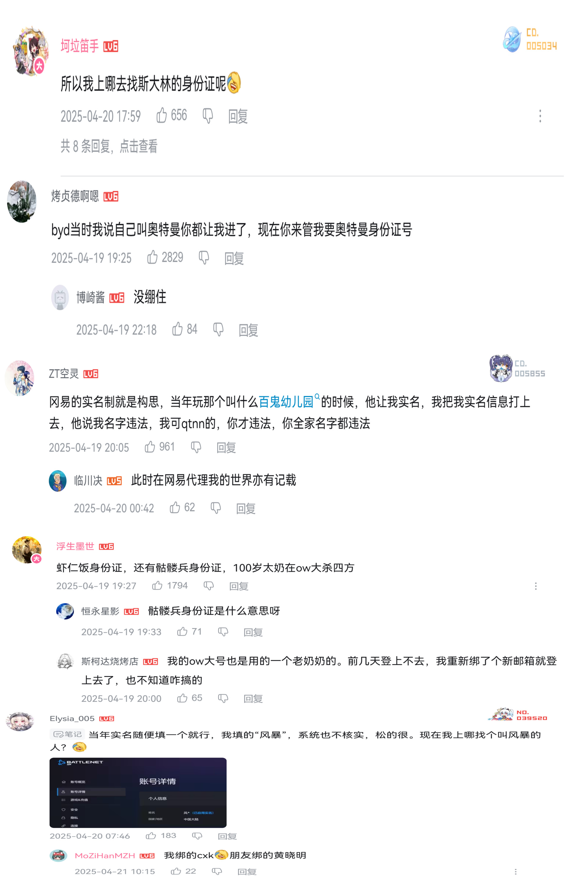 那么问题是什么呢?在上古时期,当时实名制监管时间并不严格。尤其是像我这种当时注册战网的时候才是个初中生的小屁孩儿,基本大家都是去网上搜那个身份证大全随便填进去的。有非常多人根本就不记得自己的账号绑定身份证号和那个名是什么,甚至名字和身份证估计都对不上的。你看看下面我截取的评论,只能说牢易,你真无敌辣!
