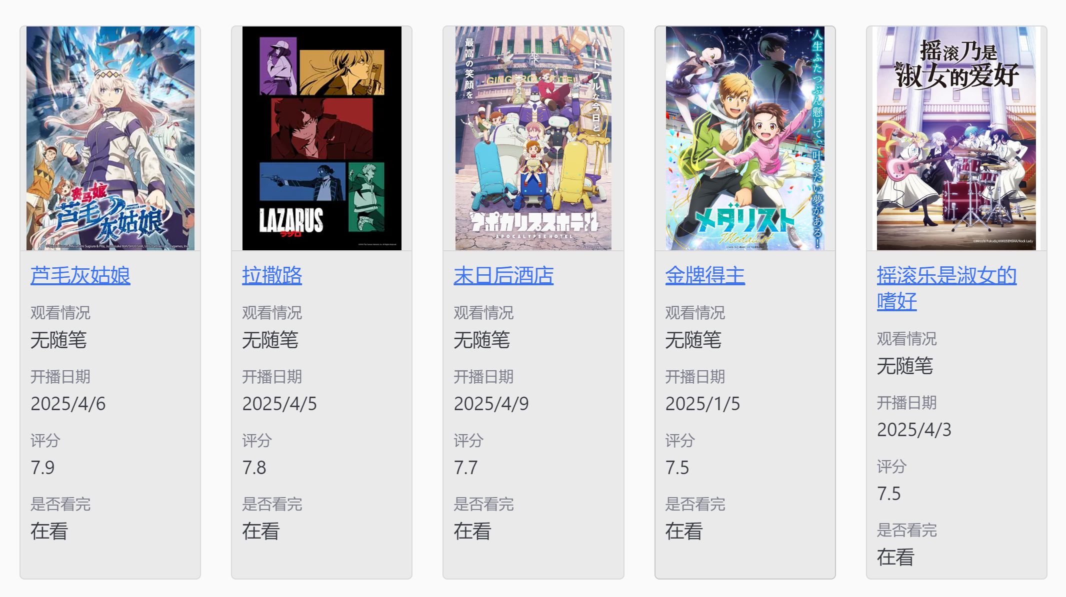 - 动画倒是追了几部,就是下面这几部。「芦毛灰姑娘」这片我是去年就有关注,知道是今年四月放送自然而然就追了,而且我还在追它的原著漫画,主要它是改编历史名马「小栗帽」的故事,我蛮感兴趣的。对了多说一句,现在对赛马领域的探究又扩展了一点,因为开始去关注最新的赛马重赏比赛,会去看赛马直播了。