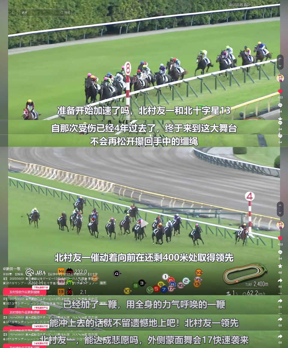 很激情很热血的解说,特别是最后的「做到了做到了!」(破音——)得加一伯分。然后解说所说的「四年前的受伤」是指骑手四年前从马匹落地背骨骨折,中间用一年多时间恢复,但直到去年才重新获得G1比赛冠军,骑乘的马匹就是「北十字星」。