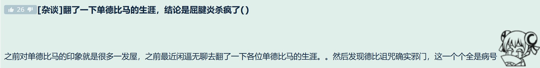 霓虹人对「德比」是有很大执念的,虽然「德比」最开始是为了促进日本赛马业发展设立的,但我觉得多少和本身的文化「一期一会物哀精神」的追求有关。毕竟是独一无二的,世代的顶点嘛。为什么说执念乃至魔怔呢,这就不得不所谓的「德比的诅咒」,「德比马」有着极高的伤病率,跑完德比就废掉的不在少数,所以状态不掉就是烧高香了。好像之前有过同一个练马场集体伤病的事情,就很能说明为啥「德比马」在古马表现不好。对于很多马主和练马师,德比是「只要赢了这场之后都无所谓」因为能赢下来基本都能成为种马。所以练马师会采用消耗性极大的方式训练准备跑德比的马,提前透支未来的竞赛能力,然后在「德比」就燃尽了,直接或者间接终结了自己的比赛生涯。赢下德比,只是同世代在当时的顶点罢了,个人认为对某个东西执念太深总是不好滴,摇摇手指头。